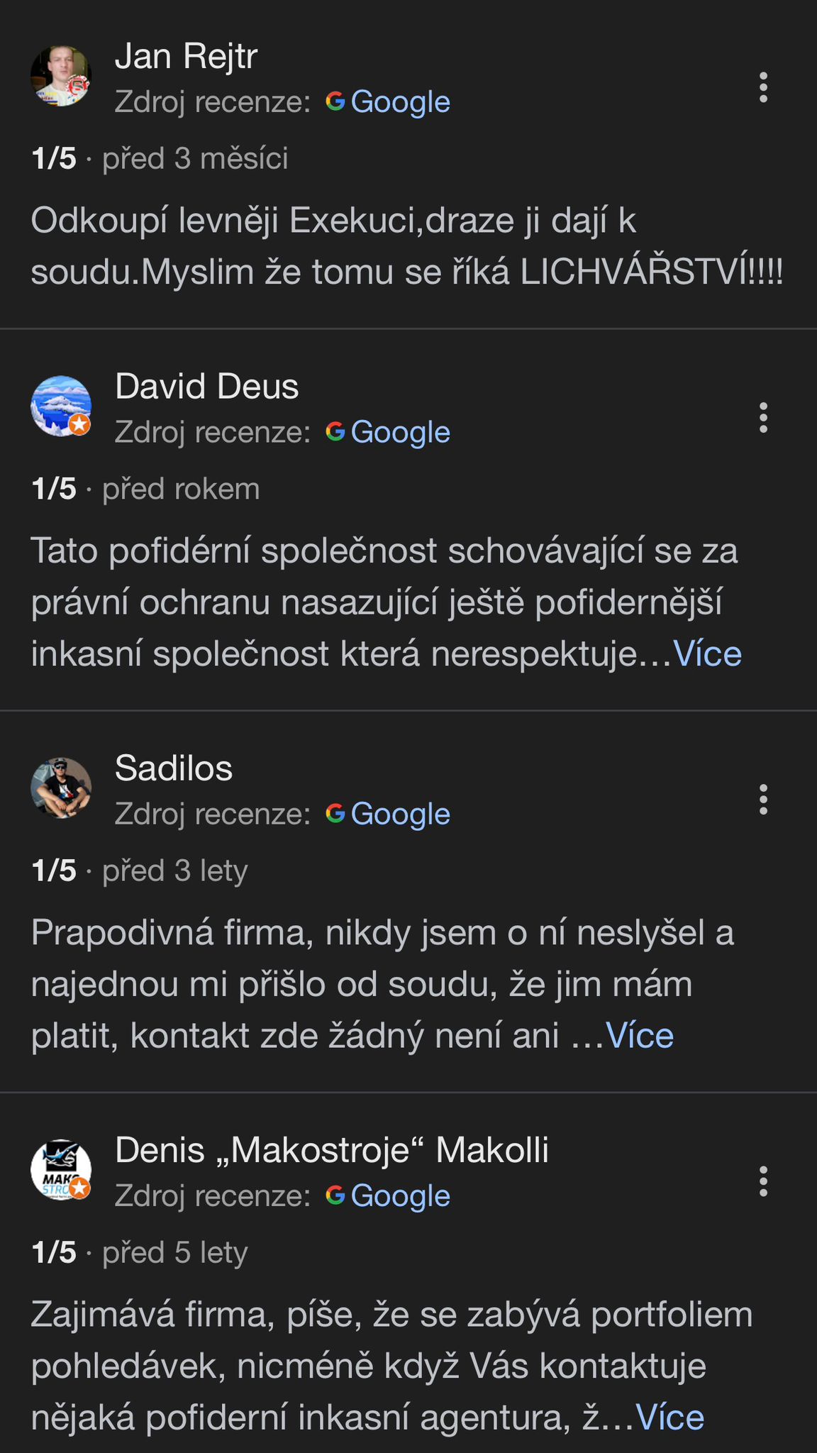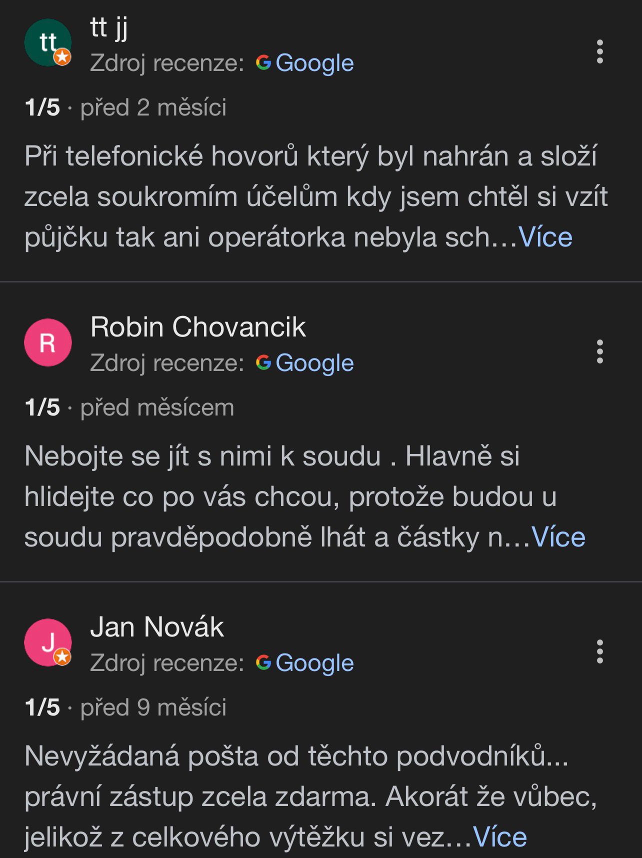 K tomu přidáváš i vlastní screenshoty z Google profilu s velmi nízkým skóre – což je přesně ten kontrast, který v článku funguje: „regulovaný fond“ vs. veřejně viditelná vlna nespokojenosti.