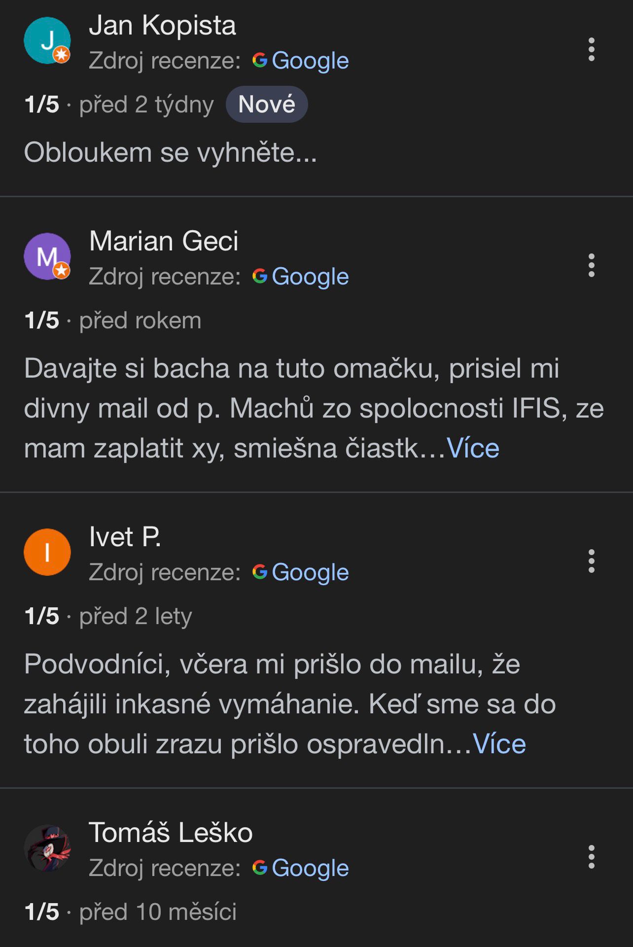 Veřejná reputace IFIS je dohledatelná i přes recenzní platformy (např. záznamy typu Firmy.cz mají uživatelská hodnocení/komentáře).