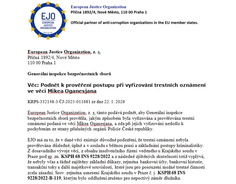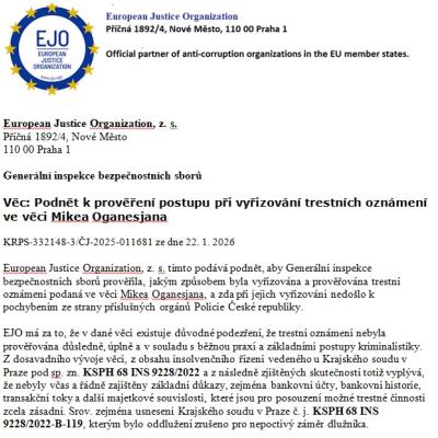 Podnět zároveň připomíná, že část předchozího postupu policejního orgánu byla podle EJO právně vadná, když bylo podání učiněné datovou schránkou posouzeno jako „nepodepsané“ a odloženo ad acta. I tato okolnost podle oznamovatele posiluje pochybnosti o kvalitě a zákonnosti dosavadního prověřování.