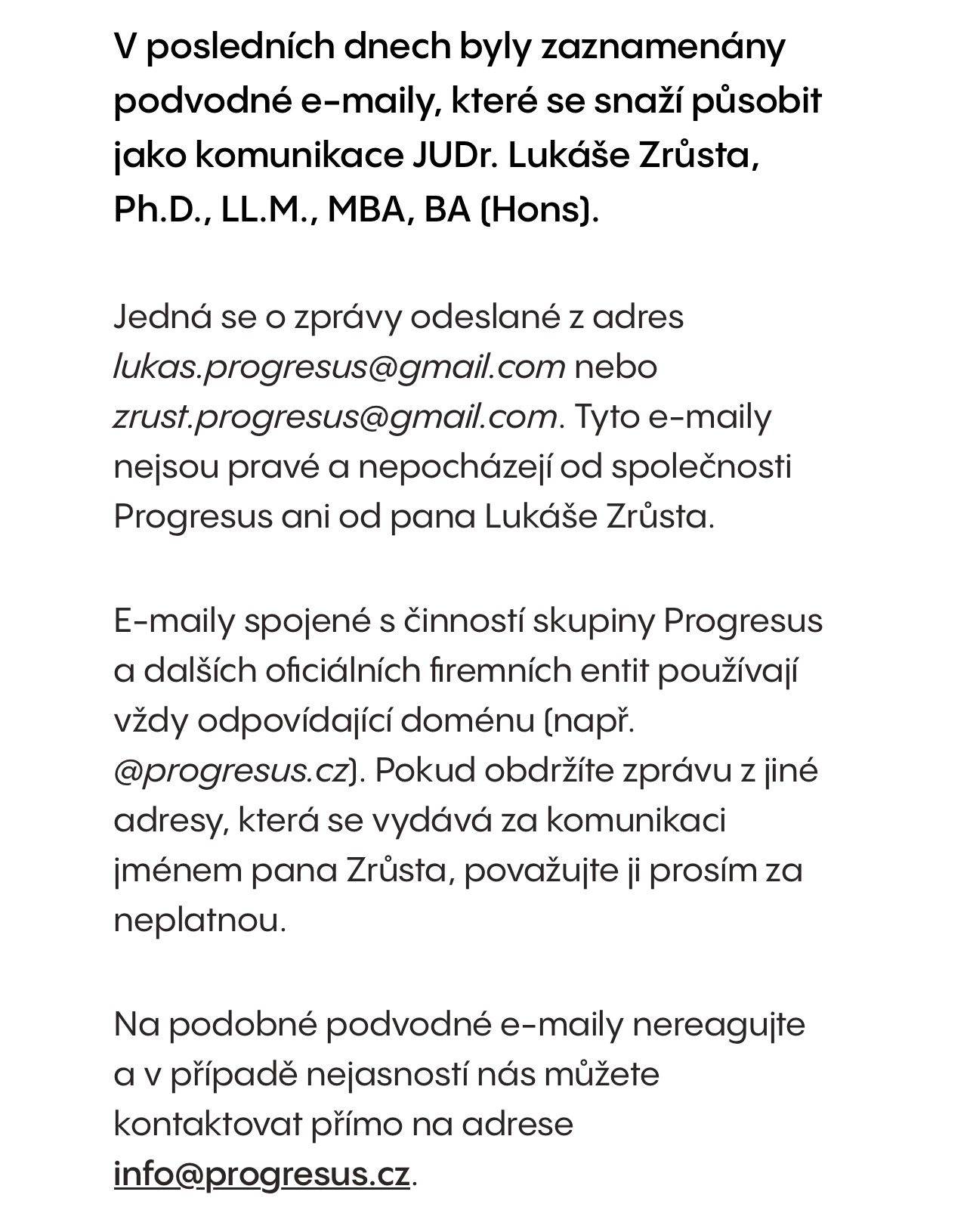 Skupina Progresus (RD Rámařov) vydává varování před podvodnými e-maily, které se v posledních dnech šíří a neoprávněně se vydávají za komunikaci JUDr. Lukáše Zrůsta, Ph.D., LL.M., MBA, BA (Hons).